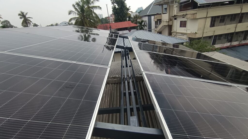 Set against a backdrop of greenery and surrounding buildings, the installation reflects how renewable energy can seamlessly integrate into everyday environments without disrupting existing structures. Such systems are built to withstand varying weather conditions, making them suitable for long-term use in both urban and semi-urban settings. With minimal maintenance requirements and reliable energy output, rooftop solar solutions offer a practical alternative to conventional electricity sources.